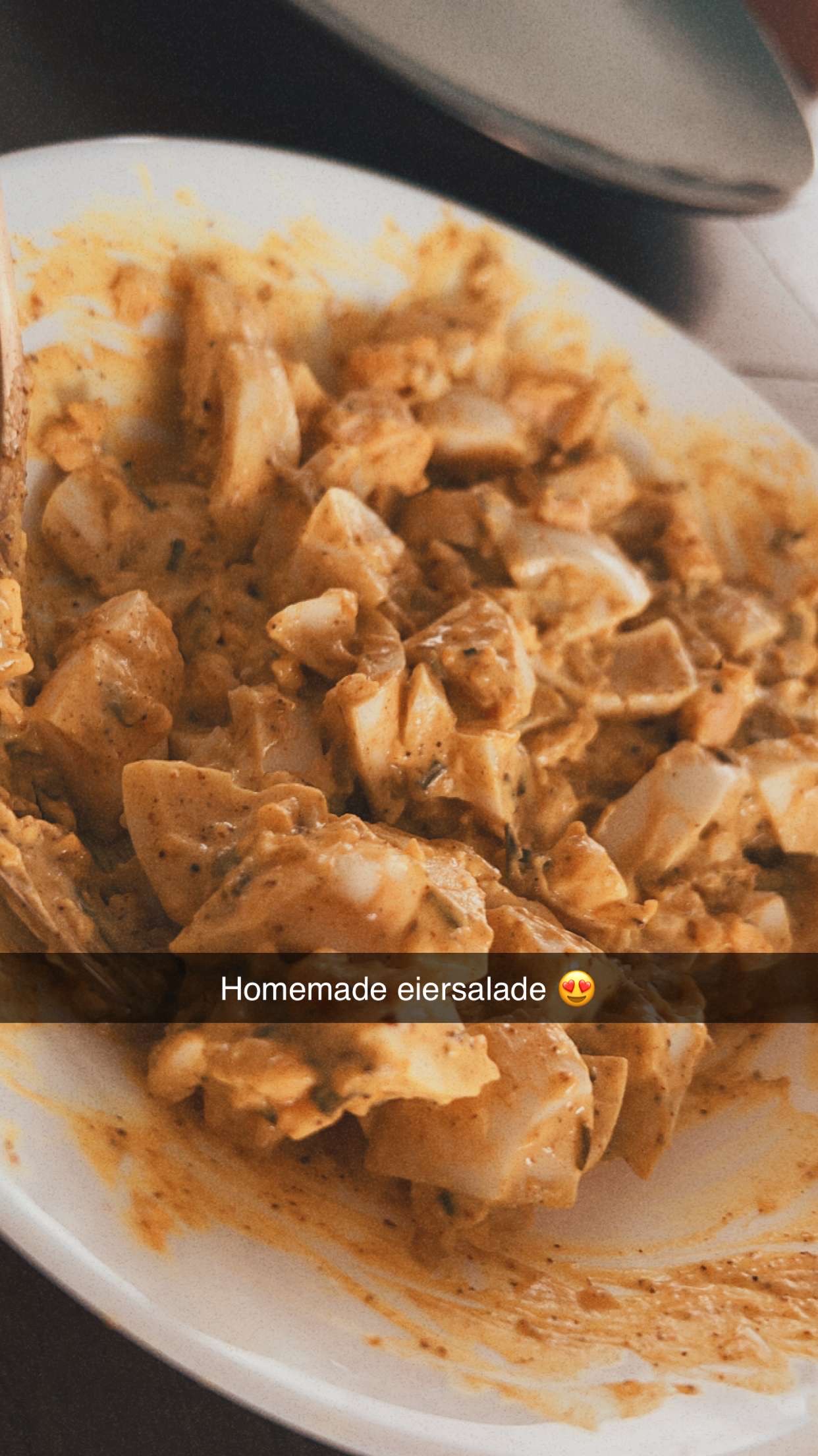 Uien koken met alle specerijen in een klein beetje olie. Uit de pan halen en in een kom doen. Mayonaise, mosterd, bieslook, eieren toevoegen en mengen. Daarna op smaak brengen met zout en zwarte peper.